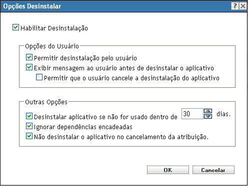 A caixa de diálogo Opções de Desinstalação permite que você habilite o aplicativo para ser desinstalado, permita que o usuário execute a desinstalação e especifique que o aplicativo seja desinstalado se não for usado dentro do número de dias especificado.