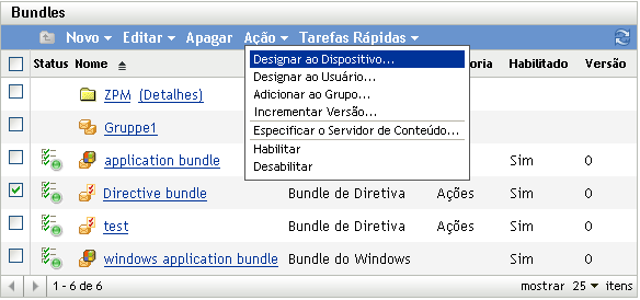 Você pode usar o ZENworks Control Center ou o Utilitário de Linha de Comando zman para atribuir bundles. O procedimento a seguir explica como atribuir um bundle usando o ZENworks Control Center. Se você preferir o Utilitário de Linha de Comando zman, consulte Comandos de bundles