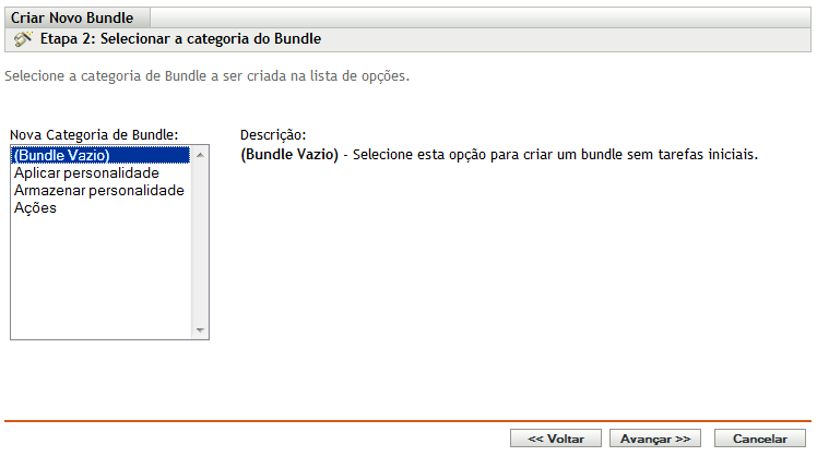 Bundle Vazio: um bundle sem tarefas iniciais. Essa categoria de bundle é útil para criar rapidamente um bundle sem executar todas as tarefas no Assistente de Criação de Novo Bundle. Após criar o bundle vazio, você poderá editar seus detalhes para adicionar designações, ações etc. posteriormente.