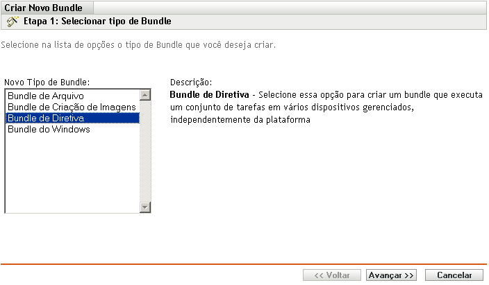 Na lista , clique em e, em seguida, clique em para exibir a página Selecionar Tipo de Bundle.