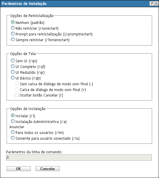 Na caixa de diálogo Parâmetros de Inicialização, selecione as opções de exibição desejadas. Você pode optar por executar a instalação com ou sem interface do usuário, exibir ou não uma caixa de diálogo pertencente ao modo no final do processo de instalação (uma caixa de diálogo pertencente ao modo demanda uma resposta do usuário antes do final da instalação) ou ocultar o botão para que os usuários não possam cancelar a instalação.