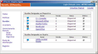 está localizado na área de notificação do Windows. Você pode clicar duas vezes no ícone para exibir as propriedades do ZENworks Adaptive Agent. O link Bundles, localizado no painel de navegação esquerdo, permite que você veja os bundles designados a você e ao seu dispositivo.