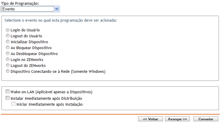 Essa opção de programação permite especificar o evento que deve ativar a ação programada.