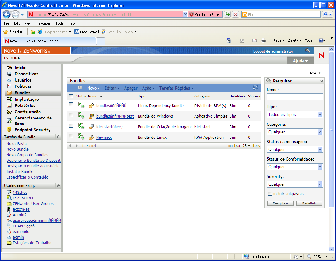 Lista de tarefas: A lista de tarefas no painel esquerdo permite um acesso rápido às tarefas executadas com mais freqüência referentes à página atual. A lista de tarefas muda a cada página. Por exemplo, a lista de tarefas na página Bundles exibe as tarefas relacionadas a bundles, enquanto a lista de tarefas na página Dispositivos exibe as tarefas relacionadas a dispositivos.