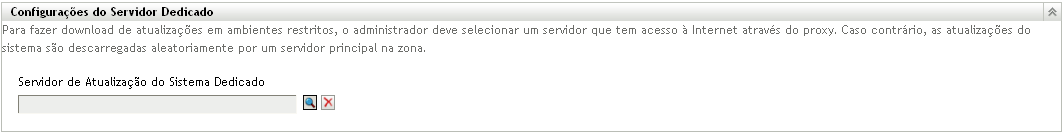 Por padrão, qualquer Servidor Principal disponível na zona de gerenciamento pode ser usado aleatoriamente para fazer download das atualizações. Porém, você pode especificar um Servidor ZENworks a ser dedicado a gerenciar seus downloads de atualizações. O servidor que você selecionar deverá ter acesso à Internet, diretamente ou por meio de um servidor proxy.