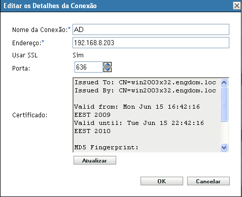 Atualização: se a origem de usuário utilizar SSL, clique no botão para atualizar o certificado, se houver um novo certificado.
