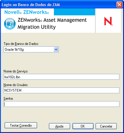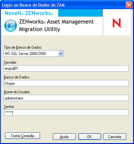 A origem da migração é o banco de dados do ZENworks Asset Management 7.5. O utilitário de migração requer que você efetue login na origem da migração com privilégios para criar, modificar e apagar. Para efetuar login no seu banco de dados: