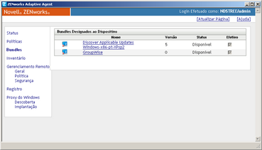 está localizado na área de notificação do Windows. Você pode clicar duas vezes no ícone para exibir as propriedades do ZENworks Adaptive Agent. O link Bundles, localizado no painel de navegação esquerdo, permite que você veja os bundles atribuídos a você e ao seu dispositivo.
