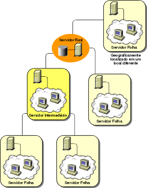 Nesta configuração, os Servidores Folha efetuam roll-up de dados para o Servidor Intermediário do próximo nível e, por fim, para o Servidor Raiz. Outro Servidor de Inventário, em um local diferente, também está conectado ao Servidor Raiz.