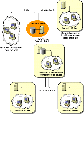 Nesta configuração, os Servidores de Inventário estão conectados ao Servidor Intermediário através de vínculos WAN lentos. O Servidor Intermediário também possui um banco de dados Inventário e transmite as informações para o Servidor Raiz. Outros Servidores de Inventário também estão conectados ao Servidor Raiz.