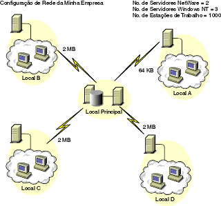 A ilustração descreve quatro locais (Local A, Local B, Local C e Local D) conectados a um local central. Ela descreve os vínculos físicos entre os locais e os tipos de vínculo em termos de largura de banda.