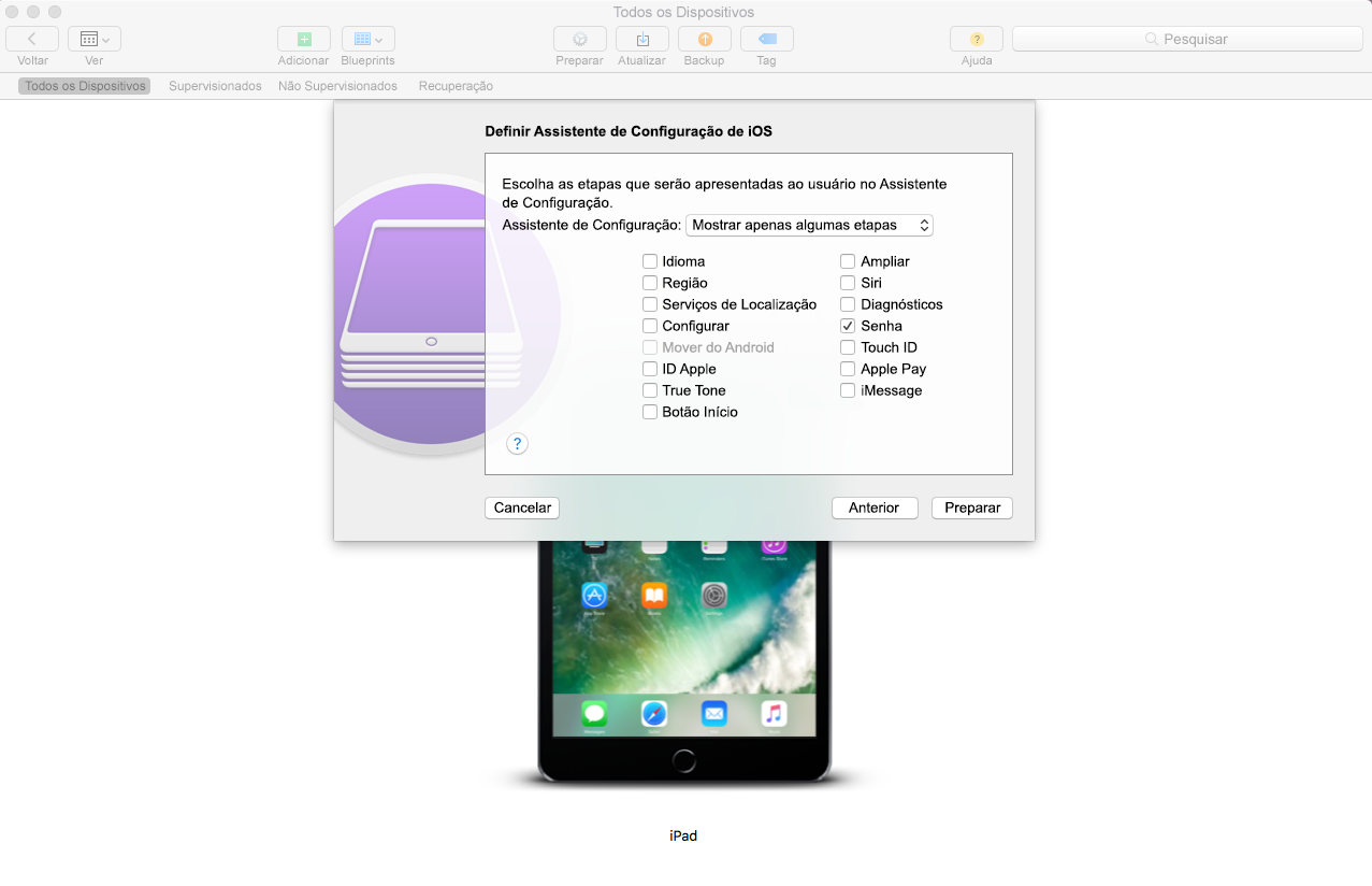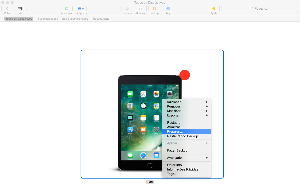 Clique o botão direito do mouse e selecione Preparar, ou selecione Preparar da barra de menus superior no Apple Configurator.