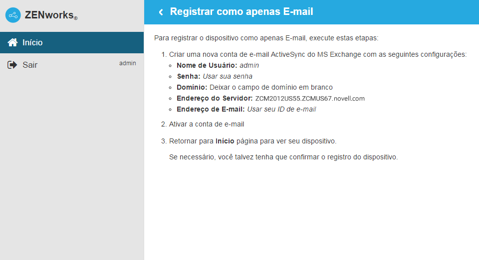 Este cenário mostra como registrar um dispositivo como Apenas E-mail na Zona de Gerenciamento do ZENworks. Este cenário detalha o procedimento para registrar um dispositivo iOS como Apenas E-mail.