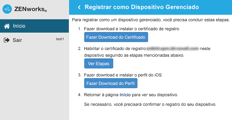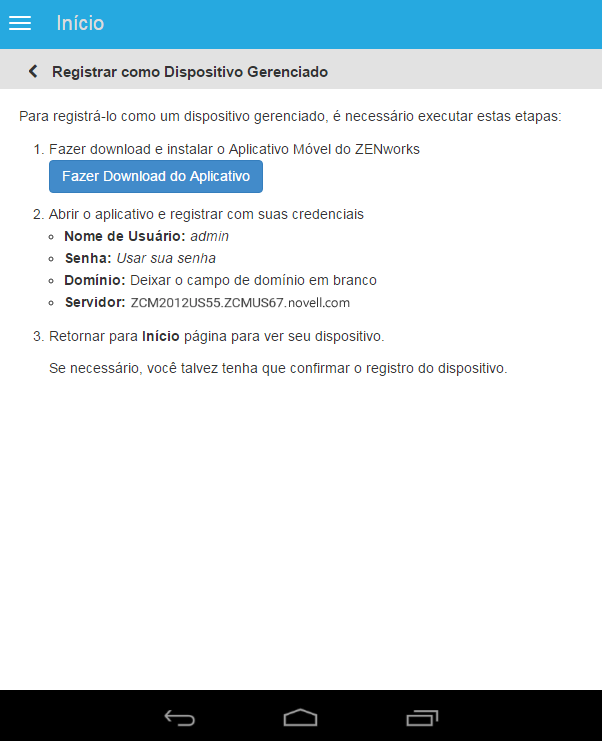 Nome de Usuário, Senha, Domínio, URL do Servidor: Use o mesmo nome de usuário, senha e domínio de registro (se necessário) que você usou inicialmente para efetuar login no Portal do Usuário do ZENworks juntamente com o URL do servidor ZENworks MDM. Você pode obter essas informações no Portal do Usuário do ZENworks, conforme exibido na Etapa 4.
