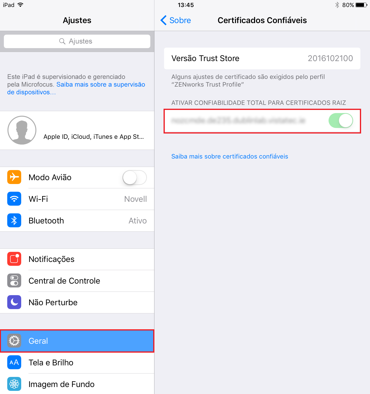 O Perfil de Confiança do ZENworks contém o certificado necessário para a comunicação segura entre o dispositivo e o Servidor Principal do ZENworks.