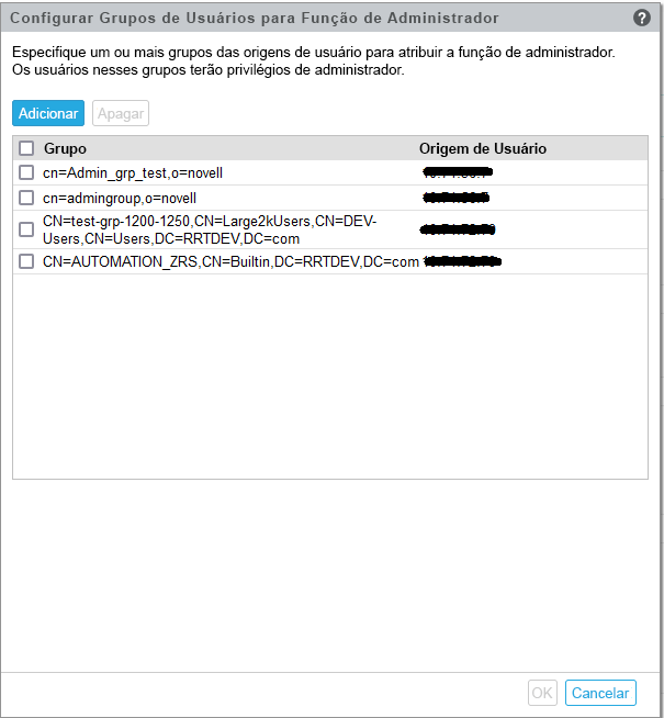 Adicionar: Clique em Adicionar para adicionar grupos de uma Origem de Usuário configurada. Esses grupos serão listados abaixo depois que forem configurados.