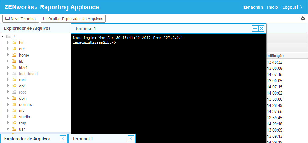 </theme>Na home page ZENworks Reporting Appliance, em Gerador de Relatórios do ZENworks, clique em Terminal e Explorador de Arquivos.
