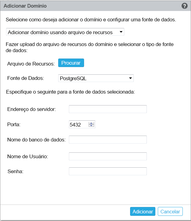 Na página Adicionar Domínio, selecione como é para adicionar o domínio e configurar uma fonte de dados.