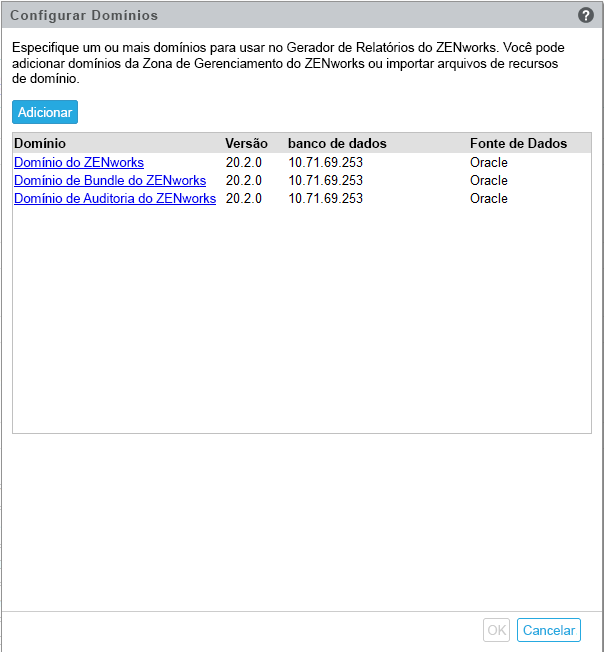Especifique um ou mais domínios para usar no Gerador de Relatórios do ZENworks. Você pode adicionar domínios da Zona de Gerenciamento do ZENworks ou importar arquivos de recursos do domínio.