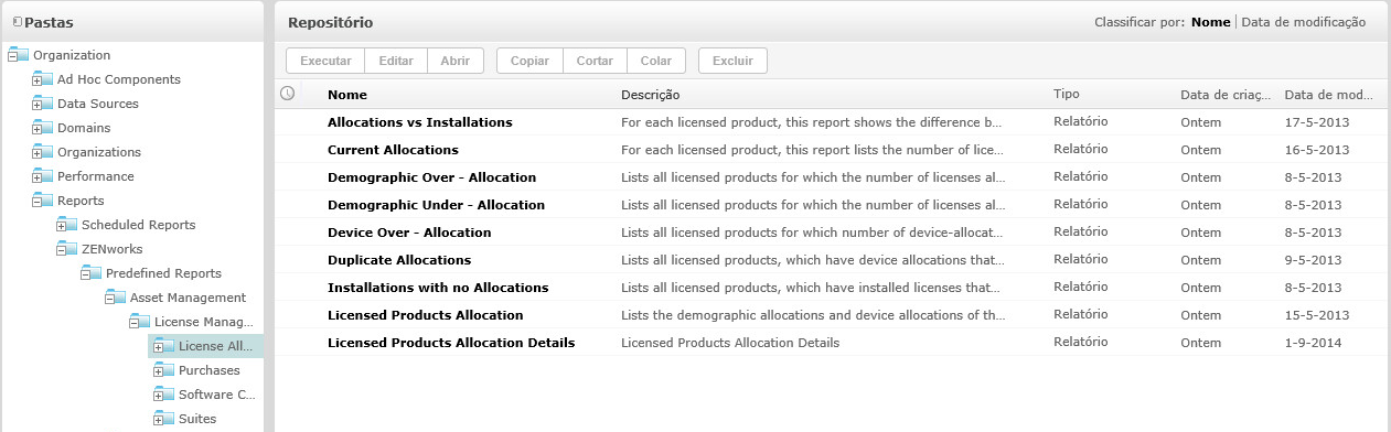 O Repositório é o armazenamento interno de relatórios, telas de análise e arquivos relacionados do servidor. Ele é organizado em pastas que contêm recursos, como sistemas de arquivos. No entanto, diferentemente de um sistema de arquivos, o repositório é armazenado como um banco de dados particular que apenas o Gerador de Relatórios do ZENworks pode acessar diretamente.