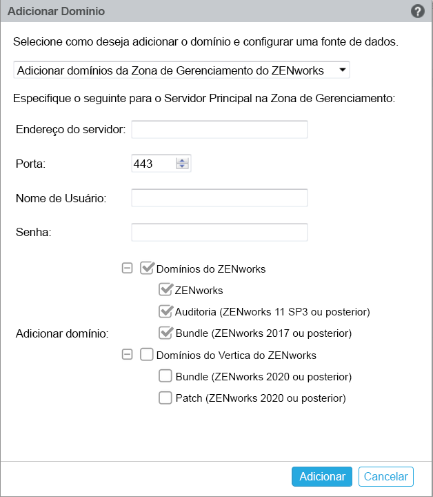Escolha Adicionar domínios da Zona de Gerenciamento do ZENworks e especifique o seguinte: