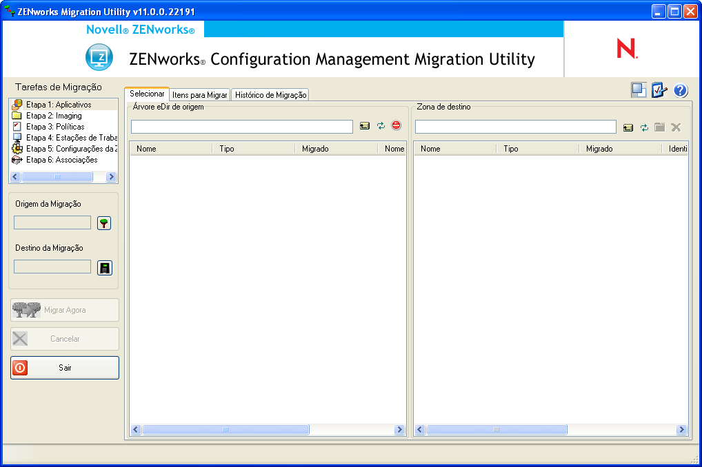 O Utilitário de Migração do ZENworks Configuration Management consiste em uma tela de migração na qual é possível modelar e executar a migração: