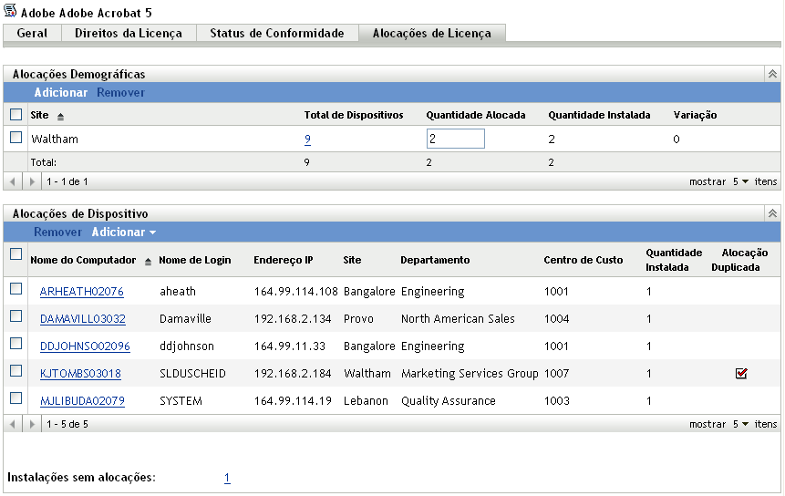 O ZENworks Asset Management permite alocar as licenças da sua organização com o objetivo de monitorar a propriedade e a distribuição das licenças. Você pode alocar licenças a dispositivos ou demográficos (sites, departamentos e centros de custo).