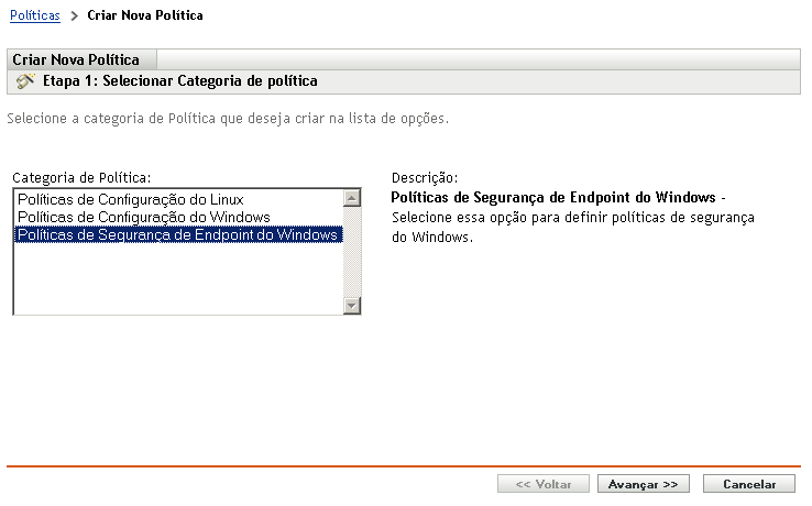 Na página Selecionar Categoria de política, selecione , depois clique em .
