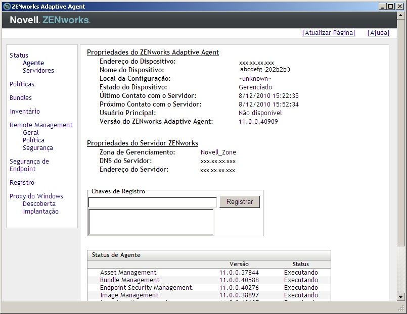 Status: Exibe informações como a última vez em que o agente contatou um Servidor ZENworks e se os recursos do Agente estão sendo executados.