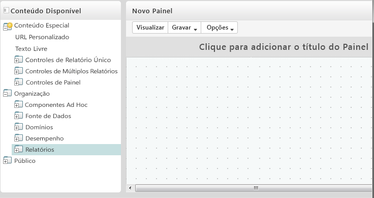 No painel Conteúdo Disponível, navegue ate a pasta necessária, clique o botão direito do mouse no nome do relatório e clique em Add to Dashboard (Adicionar ao Painel), ou arraste e solte o relatório de Conteúdo Disponível para Dashboard Viewer (Viewer de Painel).