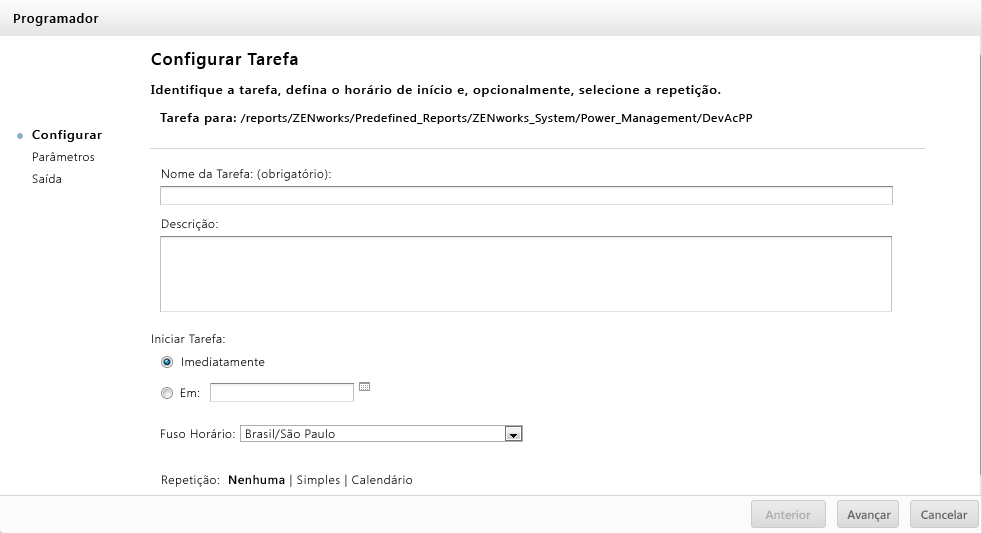 No campo Nome da Tarefa, especifique um nome para a tarefa. Por exemplo, Relatório Semanal. A descrição é opcional.