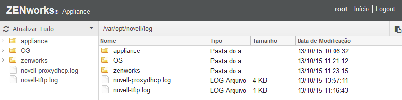 Todos os arquivos de registro monitorados no ZENworks Appliance são organizados em uma estrutura de árvore virtual, e o caminho do arquivo ou pasta específico é exibido. É possível ver os arquivos de registro no modo Final ou no modo Ver do Início.