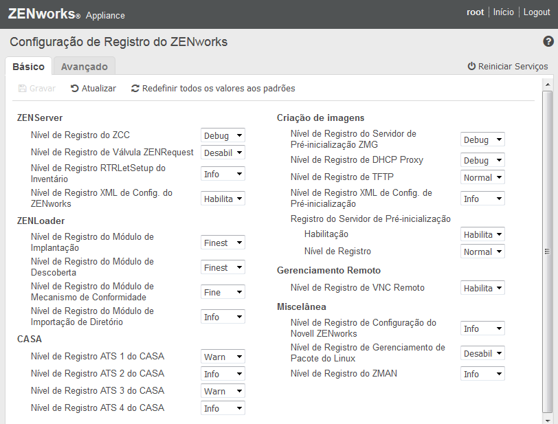 Na tela Avançado, o arquivo de configuração de registro do componente do ZENworks é carregado e pode ser editado para depurar quaisquer problemas no ambiente do cliente. Após editar o arquivo de configuração, você poderá reiniciar os serviços. É possível também listar os arquivos que foram modificados e o processo que deve ser reiniciado.