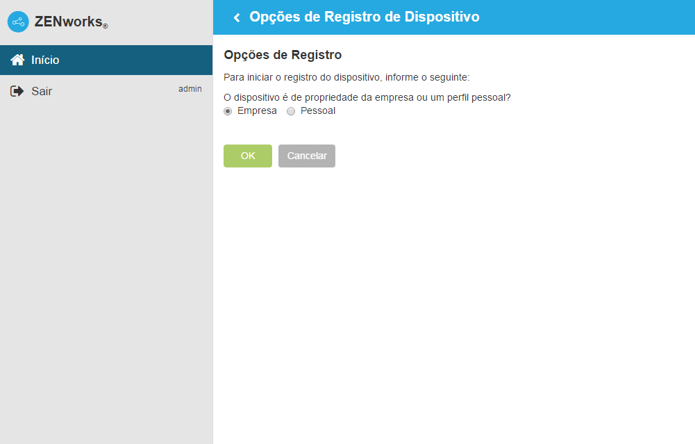 Se você configurou a política de Registro Móvel para permitir que o usuário especifique a propriedade do dispositivo (empresa ou pessoal), essas informações são solicitadas. No dispositivo, forneça as informações de registro necessárias e toque em OK.