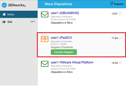 No Portal do Usuário do ZENworks, o dispositivo é exibido na lista Meus dispositivos. Neste ponto, o dispositivo foi adicionado à Zona de Gerenciamento do ZENworks, mas o registro está pendente.