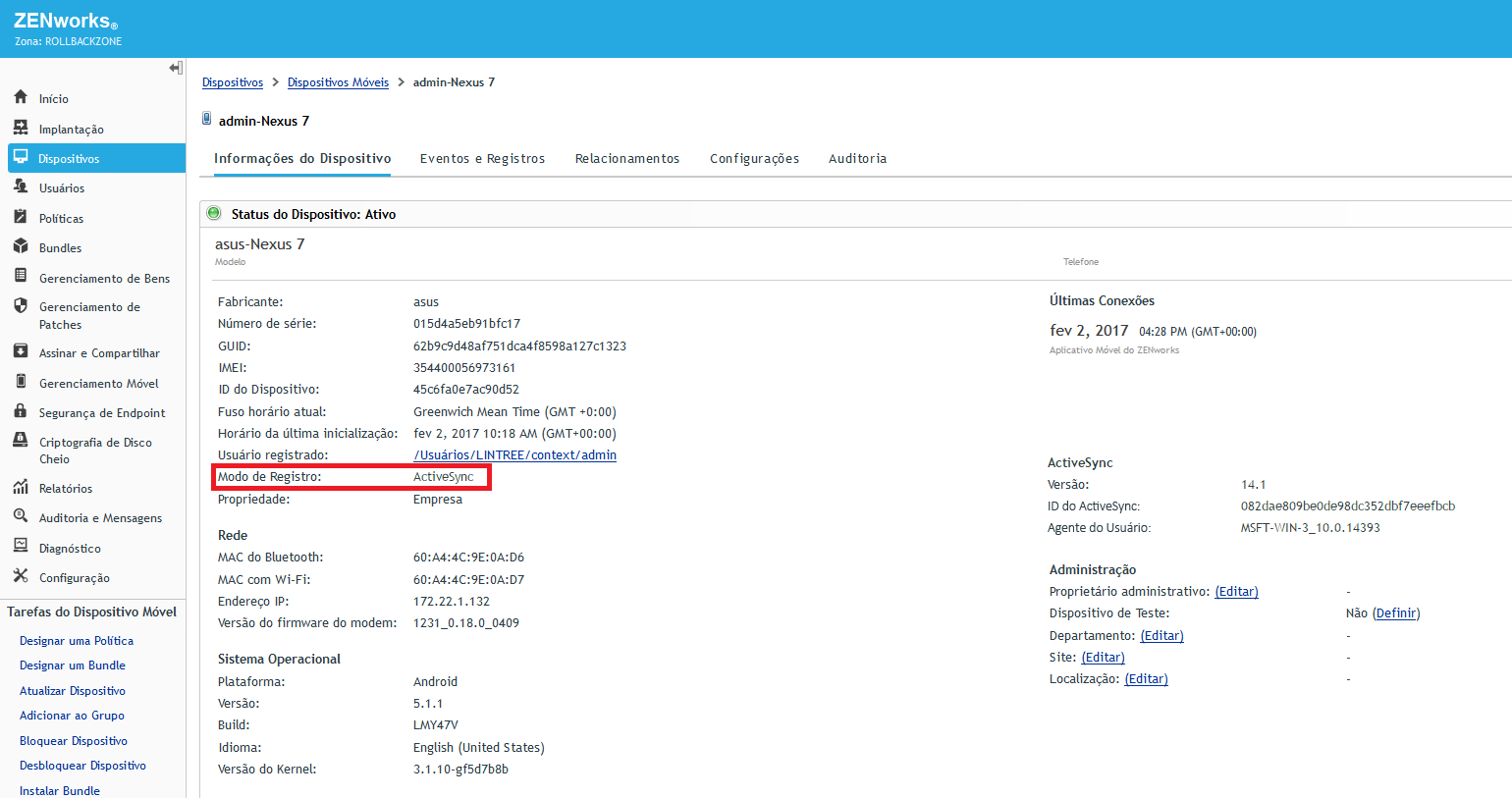 A página Informações do Dispositivo exibe o modo registrado do dispositivo.