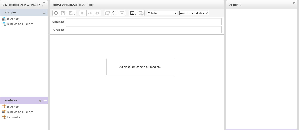 Dependendo da Tela, esses campos têm rótulos e funções diferentes. É possível arrastar e soltar itens de Campos e Measures (Medidas) para a Tela Ad Hoc.