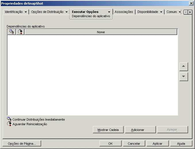 A página Dependências do Aplicativo, ilustrada a seguir, permite criar uma lista de aplicativos (chamados de aplicativos dependentes) que devem ser distribuídos e disparados antes que o aplicativo em questão (chamado de aplicativo primário) seja distribuído e disparado.