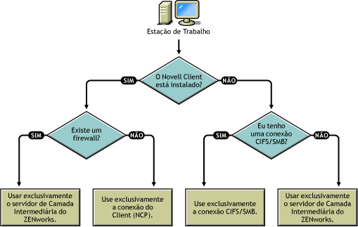 Se o Novell Client não estiver instalado na estação de trabalho, o ZENMUP verificará se existe uma conexão CIFS/SMB. Em caso positivo, ele utilizará a conexão CIFS/SMB exclusivamente e, em caso negativo, ele utilizará o Servidor de Camada Intermediária do ZENworks para acessar os arquivos.