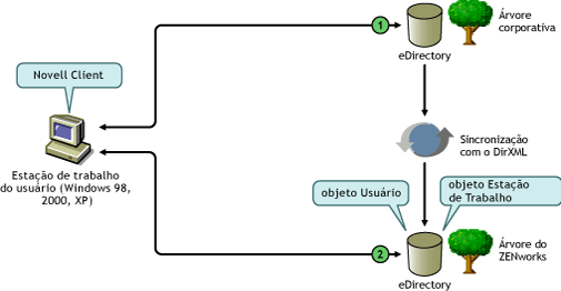 A ilustração a seguir mostra um processo simplificado do uso do Novell Client para autenticação em uma árvore do ZENworks e, ao mesmo tempo, na árvore corporativa.
