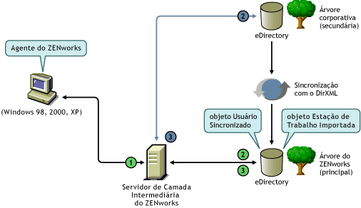 Se configurar uma árvore do ZENworks e desejar usar o Agente do Desktop Management e o Servidor de Camada Intermediária para autenticação, você poderá designar a árvore do ZENworks como o primeiro site de autenticação ou “domínio primário de autenticação” e a árvore corporativa do eDirectory como site subseqüente de autenticação ou “domínio secundário de autenticação”. Para obter mais informações sobre a configuração de domínios de autenticação, consulte Domínios de Autenticação (instalação do Xtier 2.6.2).