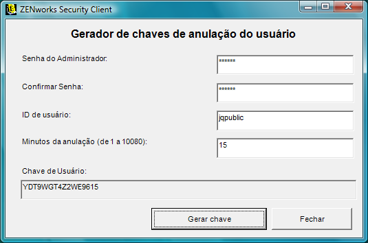 Essa chave pode ser lida para o usuário durante uma chamada para o suporte técnico ou pode ser copiada e colada em um e-mail. Em seguida, o usuário digita a chave na janela Administração do ZENworks Security Client (consulte o Guia do Usuário do Security Client do ZENworks Endpoint Security Management). Essa chave é válida para a política desse usuário e apenas durante o tempo especificado. Depois que a chave for usada, ela não poderá ser usada novamente.