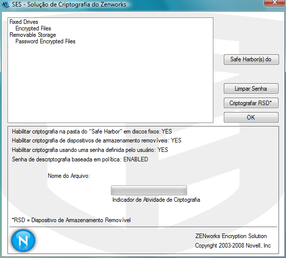Quando disponibilizada pela política, a pasta Arquivos Compartilhados é criada em todos os dispositivos de armazenamento removíveis conectados ao computador que está executando o ZENworks Endpoint Security. Os arquivos dessa pasta podem ser acessados pelos usuários de outros grupos de política, usando uma senha criada pelo usuário. Os usuários que não estiverem executando o ZENworks Endpoint Security podem acessar esses arquivos com o utilitário ZENworks File Decryption. Entre em contato com o Suporte da Novell para obter mais informações sobre o utilitário ZENworks File Decryption.