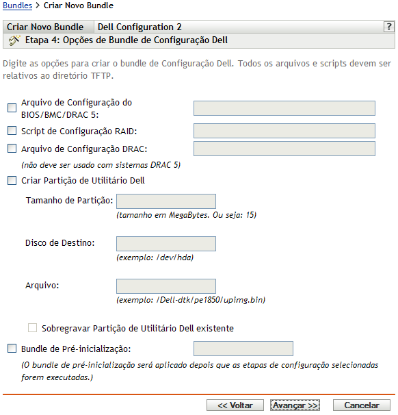 O bundle de Configuração Dell permite que você configure certos dispositivos Dell com BIOS/BMC/DRAC 5, RAID, DRAC 4 específicos ou anteriores e configurações de partição do utilitário Dell. Por fim, permite a execução de um bundle de Pré-inicialização para criar uma imagem do dispositivo com um sistema operacional.