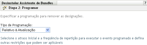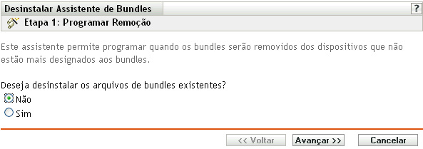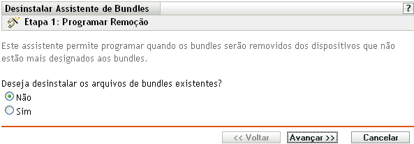 O Assistente de Desinstalação de Bundle permite optar por desinstalar ou não o software dos dispositivos designados anteriormente. Se você indicar que deseja remover o software, poderá especificar uma programação de desinstalação do software.