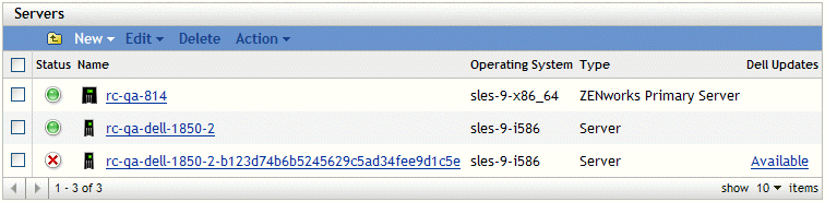 Um link na coluna Atualizações Dell indica se há um bundle de Pacote de Atualização Dell disponível no repositório de pacotes do ZENworks para cada servidor Dell PowerEdge listado. Uma atualização está disponível nestas situações: