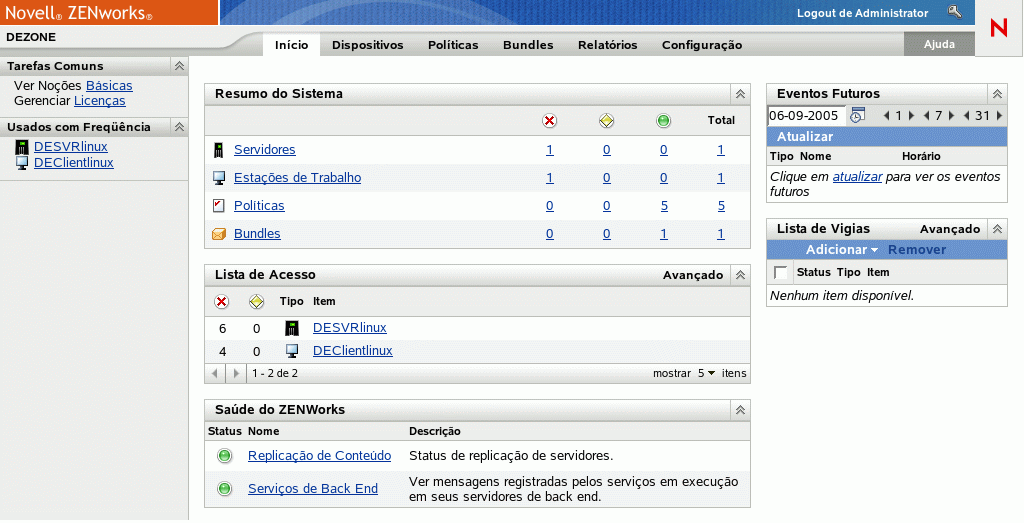 O sistema ZENworks é administrado no nível da Zona de Gerenciamento pelo Centro de Controle do ZENworks, um console de browser da Web baseado em tarefas.