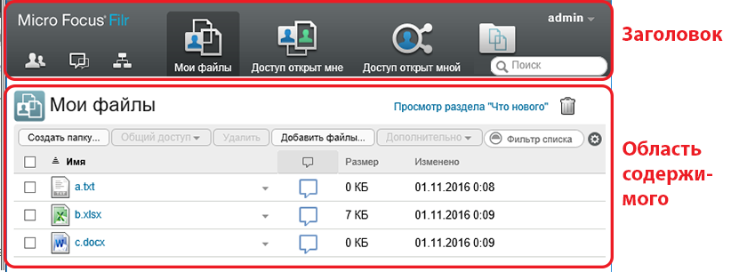 Область содержимого во Filr — это то место, где выводится большая часть информации.
