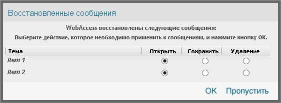 Пропустить: Оставляет сохраненные сообщения на диске, но не восстанавливает их в WebAccess. При следующем запуске приложения WebAccess окно "Автосохранение" откроется снова.