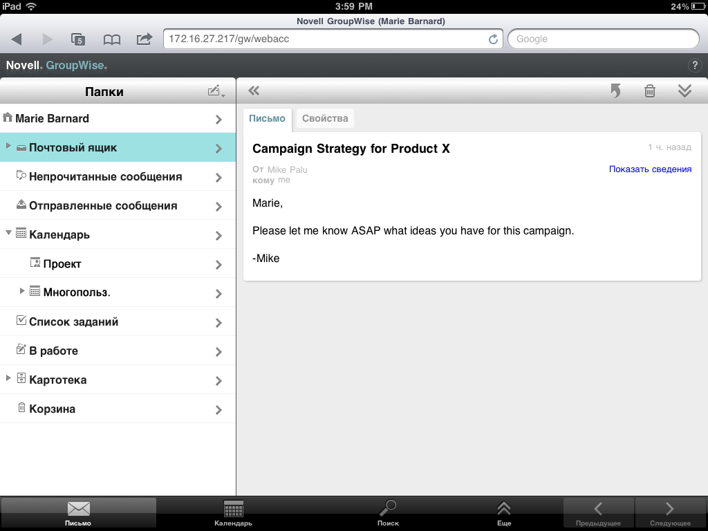 Когда пользователь входит в систему в программе GroupWise через веб-навигатор планшета, отображается его почтовый ящик.